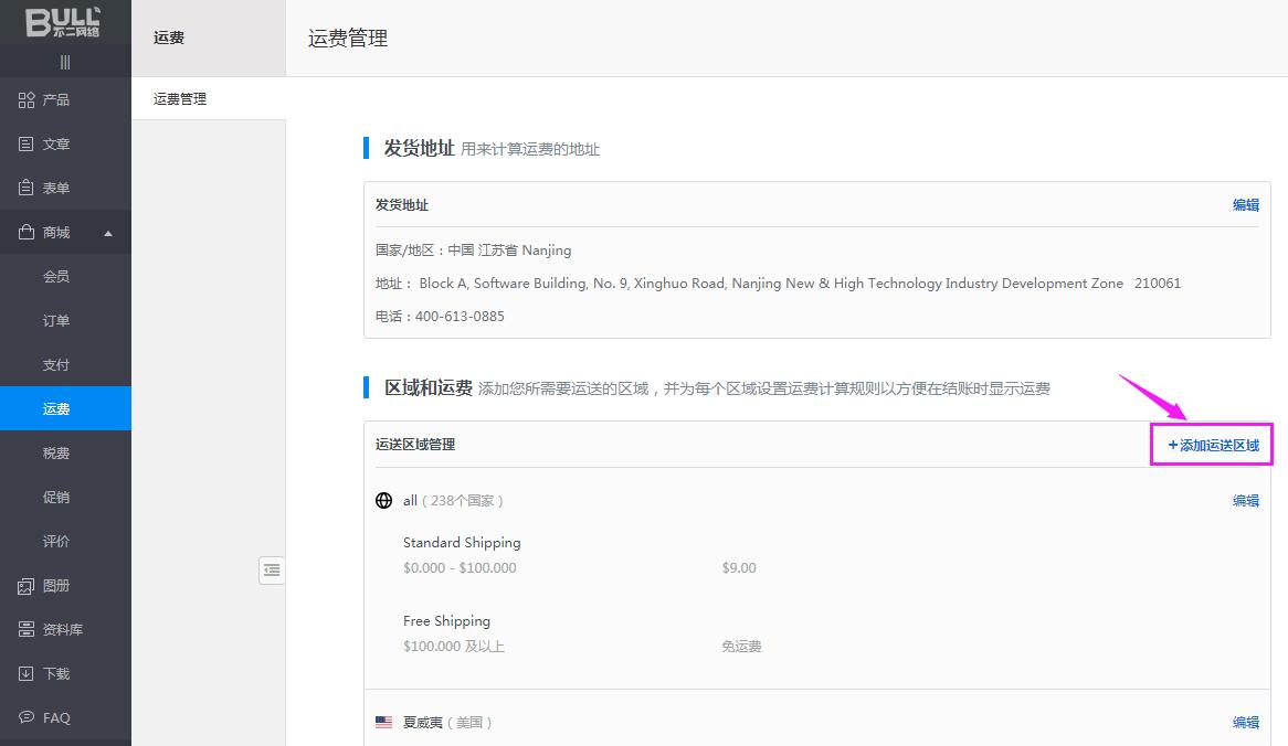 ◆通过运费管理页面上的“添加运输区域”按钮可以添加运费区域。