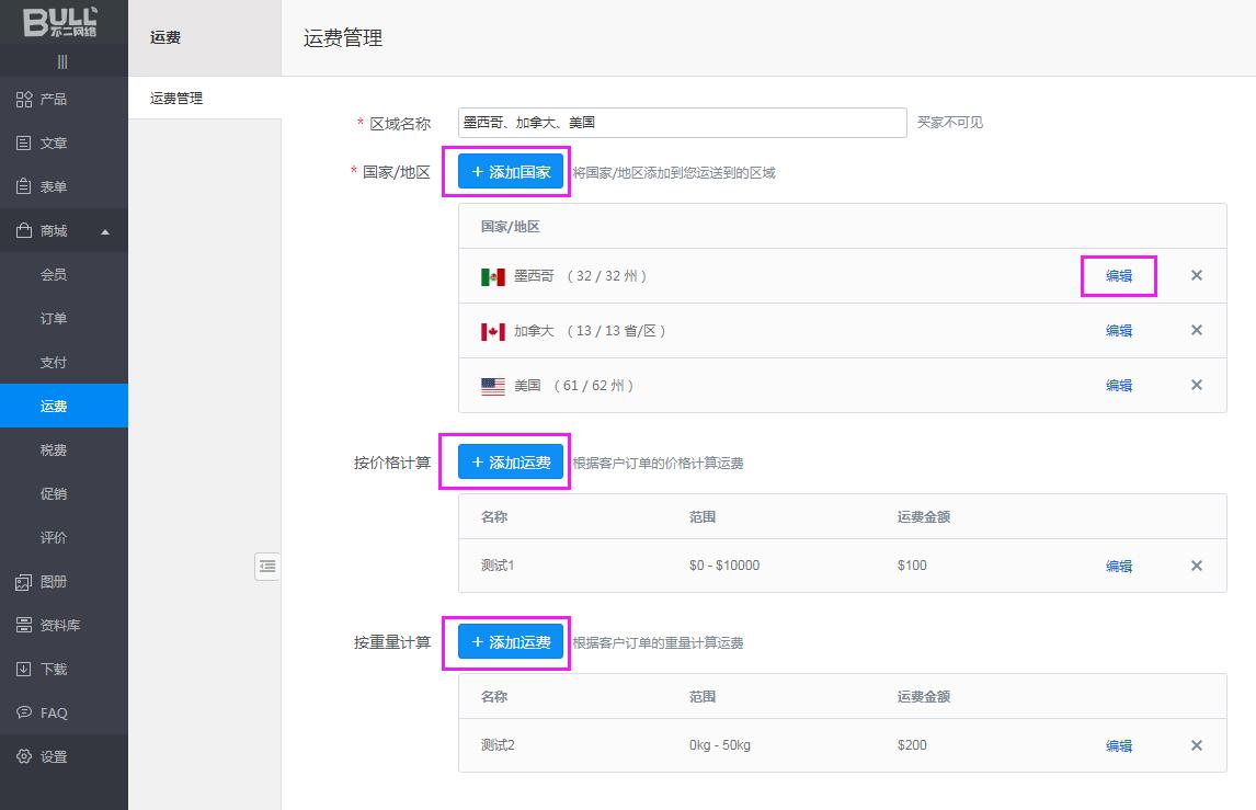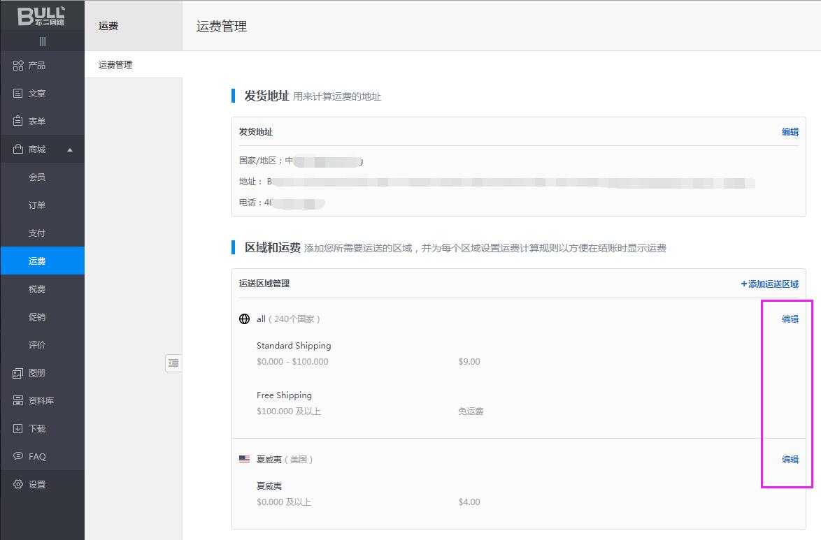 1、通过页面上的区域和运费“编辑”按钮可以编辑区域和运费信息;