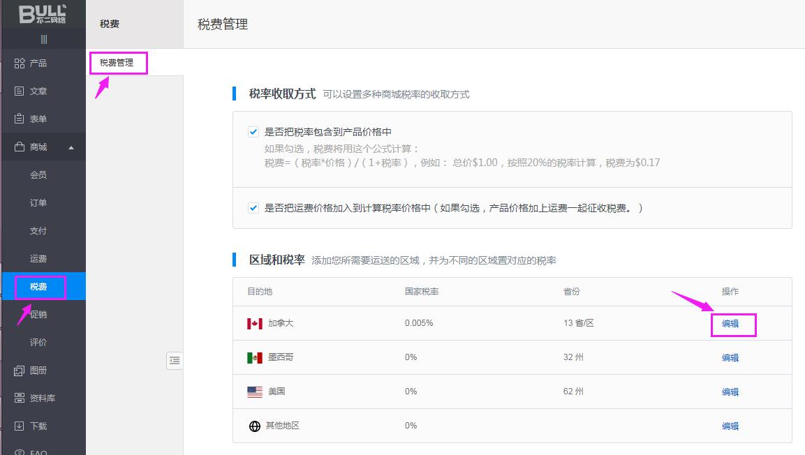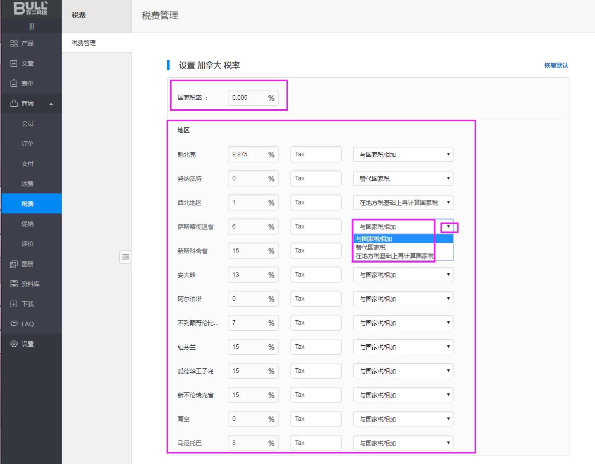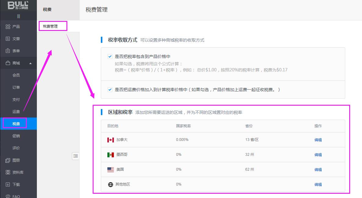 (1)这里的区域同运费设置中的区域保持一致,建议先在运费系统中设置支持运送的国家和地区,然后在税费的区域设置中设置对应区域的税率,如下截图所示界面: