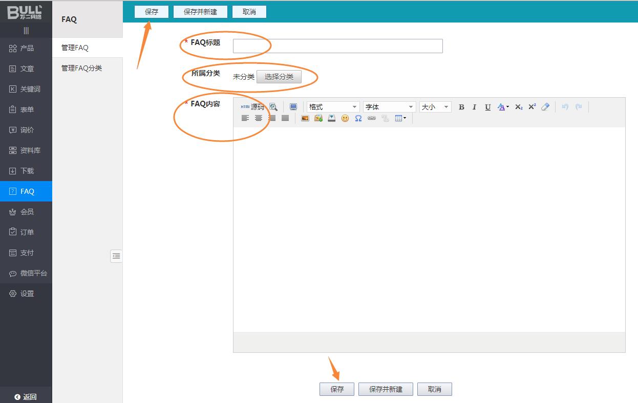 第3步:单击“添加FAQ”按钮,输入FAQ标题、选择所属分类,输入FAQ内容,然后保存;然后这条信息就会自动显示在网站前台;