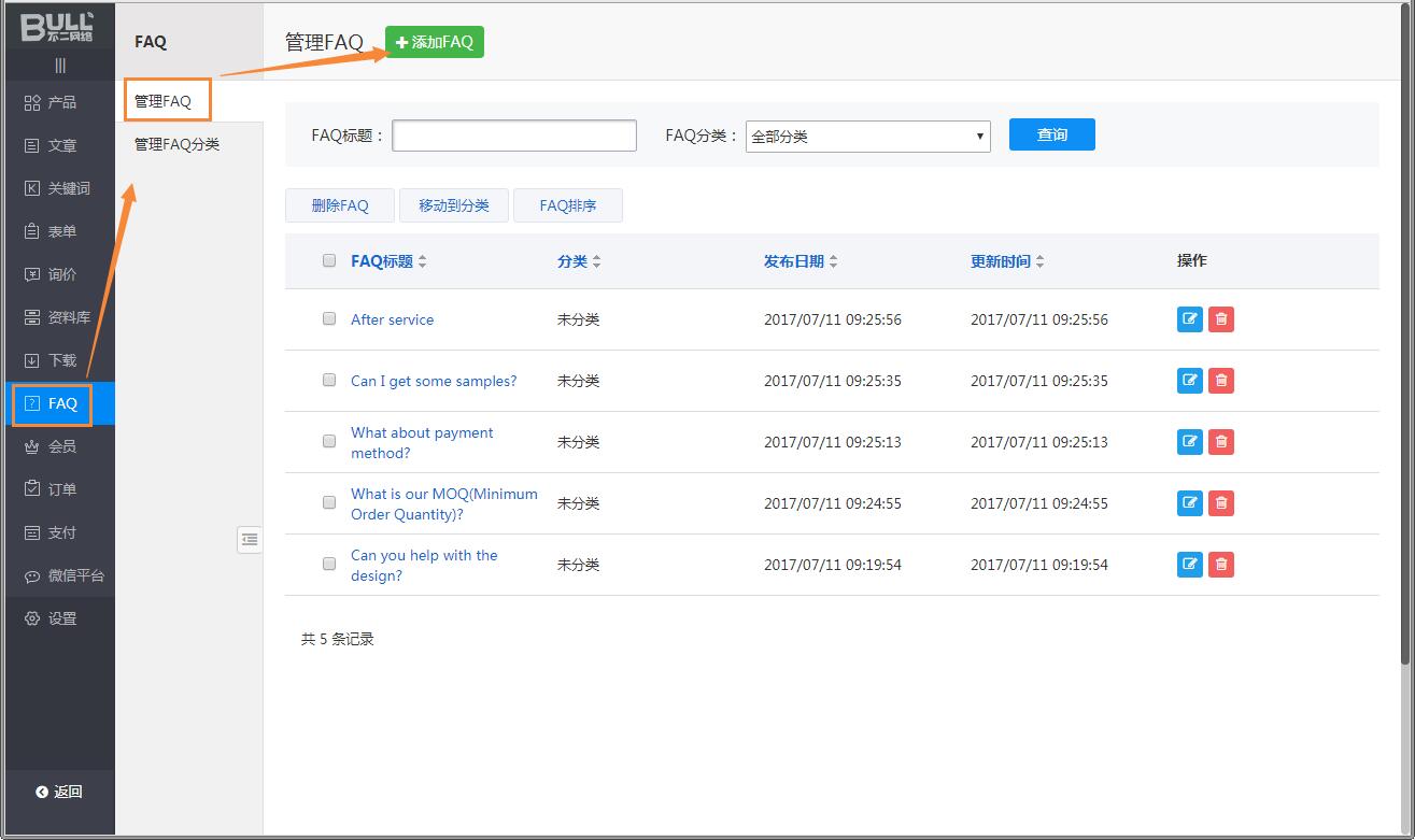 第2步:单击“FAQ”,默认进入“FAQ管理”界面;