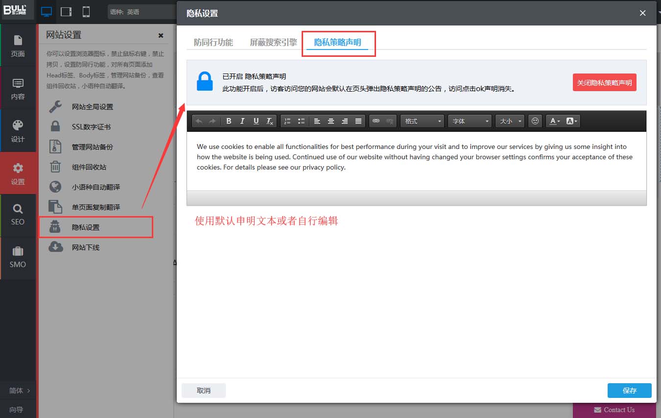 【操作方式】登陆进入编辑网站-》设置-》隐私设置-》隐私策略申明,点击“开启隐私策略申明”,使用默认的申明文本或者自行编辑,最后点击保存。需要额外说明的是,开启“隐私策略申明”后,要重新发布网站才能在前台生效。