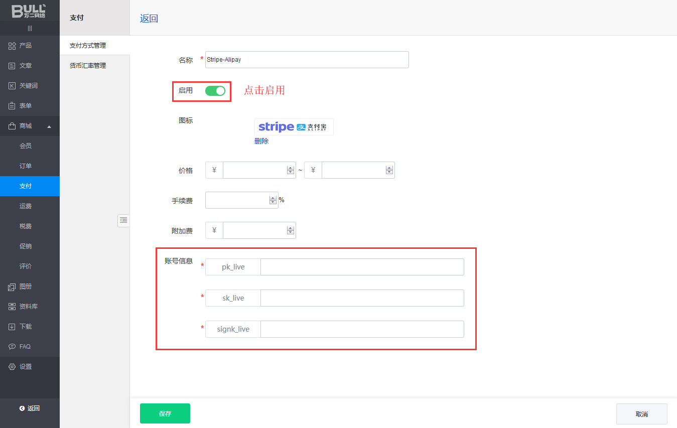 【操作方式】后台商城管理-》支付方式管理-》编辑Stripe-Alipay支付。