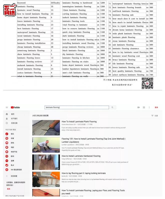 在搜索引擎中“how to install laminate flooring”这个关键词的搜索量排第“3”,在“YouTube”中排前5“百万搜索量视频”话题方向就是这个,如果你是地板厂家来生产跨境电商内容,您的营销方向找到了吗?(备注:做搜索引擎优化的朋友再配合“Blog Post等相关性外链”和“红人”会更完美)