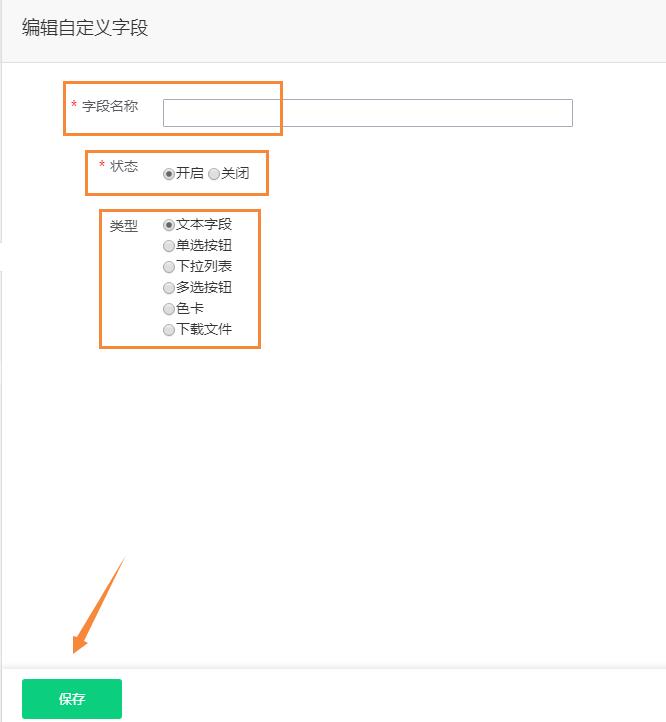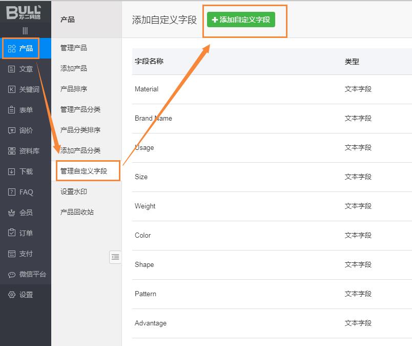 第3步:输入字段名称,选择一种字段类型,然后保存,即成功创建一个产品自定义字段。再编辑产品时,产品属性中都会出现这样的一个字段让填写,若不填写页不会出现在网站前台。