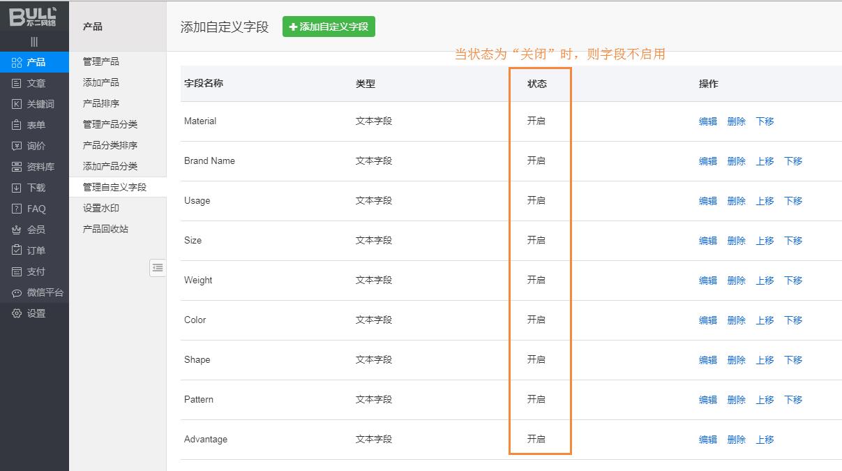 后台产品管理-》管理自定义字段-》添加自定义字段页面,增加“状态”字段,默认值为“开启”,当切换到“关闭”状态时,该字段不在添加产品页面出现,也不在前台产品详情和产品列表上展示,操作入口如下截图所示。