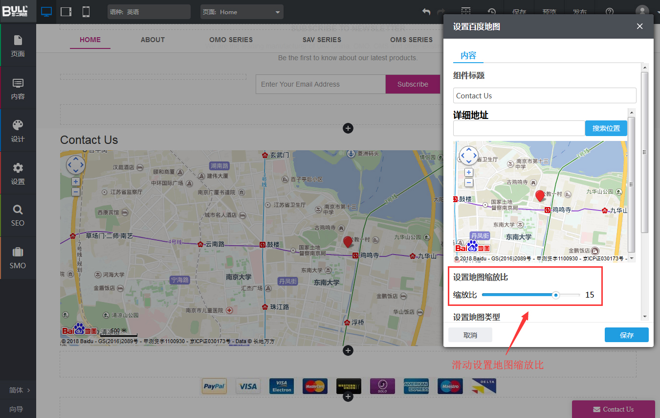 【应用场景】用户希望根据需求调节网站百度地图的缩放大小时,可以使用地图缩放比设置调节,自由地决定百度地图的缩放大小范围。
