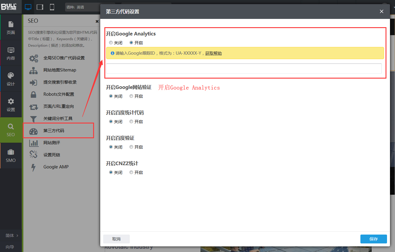 登陆进入后台-》编辑网站-》SEO-》第三方代码-》开启Google Analytics电子商务跟踪。